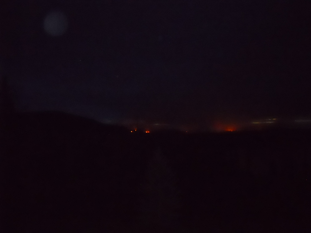 Daytime smoke and fire from the many slash piles on the south shore.Eerie night time glow from the many fire piles on the south shore.