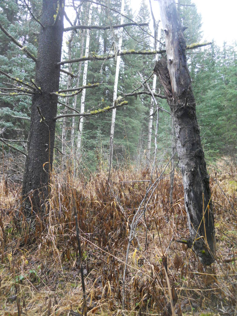 With all the roads and trails amid the residential areas of Lac des Roches there is no shortage of public places to walk or hike. Walking through the bush during Autumn is particularly appealing due to the simple fact that vision is improved as the leaves fall from the branches. Even though bear sightings have not been reported since this spring, it is comforting to have some extra visual distance between yourself and whatever might be out there when you are bushwhacking. One doesn’t have to walk far from their residence to find the unusual, disturbing and pleasing sights that turn a simple walk into an adventure at Lac des Roches. The number of beetle-killed pine trees that are discovered down on the trails now is boggling. Falling trees seems to be a daily occurrence on the more wooded trails, thus completing the devastating cycle of the pine beetle infestation. Although it is rare to find human garbage on local trails, those that skirt the highway are often littered with a surprising number of beer cans and disposable coffee cups which reappear annually, despite the clean-up efforts of several residents and the many warning signs along the highway. On a lighter note, there are some tasty gems in the woods, even this time of year. Although somewhat dry and frozen, there are plenty of rose hips still hanging onto bushes which are a seedy treat if you have the patience to spit out the dozen or so seeds as you chew on it. Or better still are the many clumps of high bush cranberries which have only a single seed. Despite their bitter taste, they are juicy and thirst-quenching and as a bonus, the tough skin will last for quite some time, kind of like nature’s chewing gum. Other sights out there will easily cause a second look and make yourself question what you are seeing. Was that big dark brown thing there yesterday and is it a moose or the dirt on an uprooted tree? Below are two strange sights on a local path that, despite being passed on a regular basis, always stir an emotion, a koala bear and the hanging tree. What an adventure playground we have at our doorstep!
