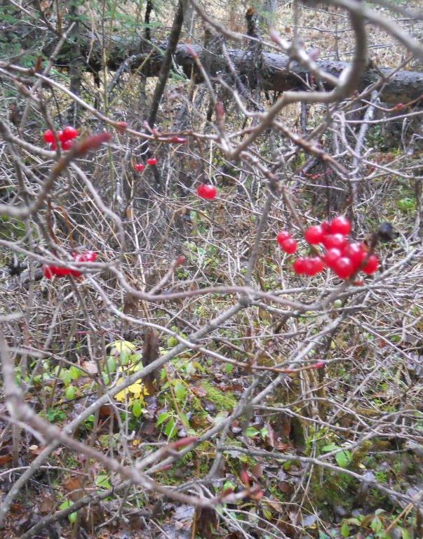 The knot on this cottonwood tree trunk looks like a koala bear.The base of this dead aspen is 2 feet off the ground – a hanging tree.Frost bitten cranberries – juicy fruit gum!