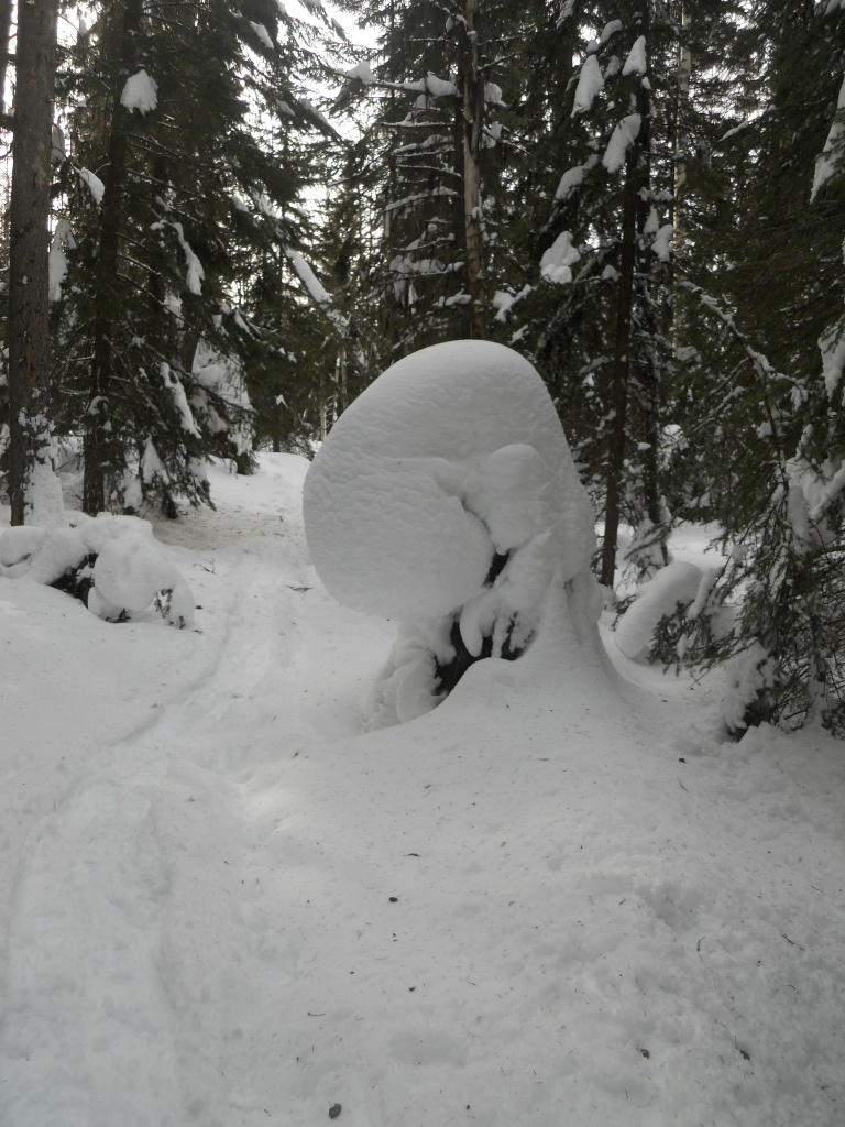The blanket of deep snow on the lake has kept the ice quiet this winter.  Absent this year are the haunting bangs and warbles of cracking ice as the temperatures changes back and forth from the chilly nights to the warmish days.  In their place this year are the sounds of wood expanding and contracting which fills the morning and evening air.  Since our forests are a mixture of deciduous and conifer trees, it is unclear if the sound is particular to any species, but most definitely, their are strange noisessnow on tree emitting from tree trunks. This small spruce tree on the Falkner Lake trail might emit a noise but the shroud of over 3 feet of snow would certainly muffle it.